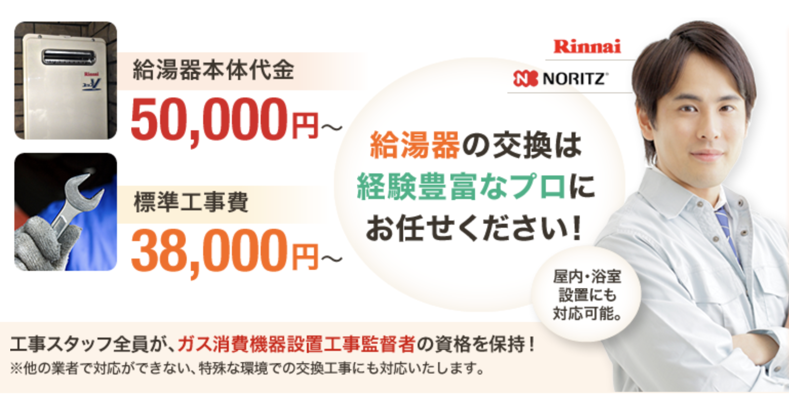 「費用が安く、サービスや保証も充実している」という特徴から、選ぶ方が多いのが、給湯器専門の交換業者。