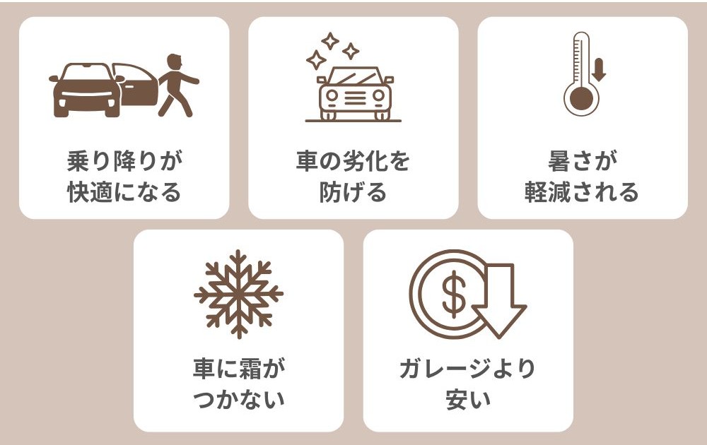 カーポートのような屋根下に停めておくだけで、真夏の車内温度が20度以上低くなるともいわれているよ!