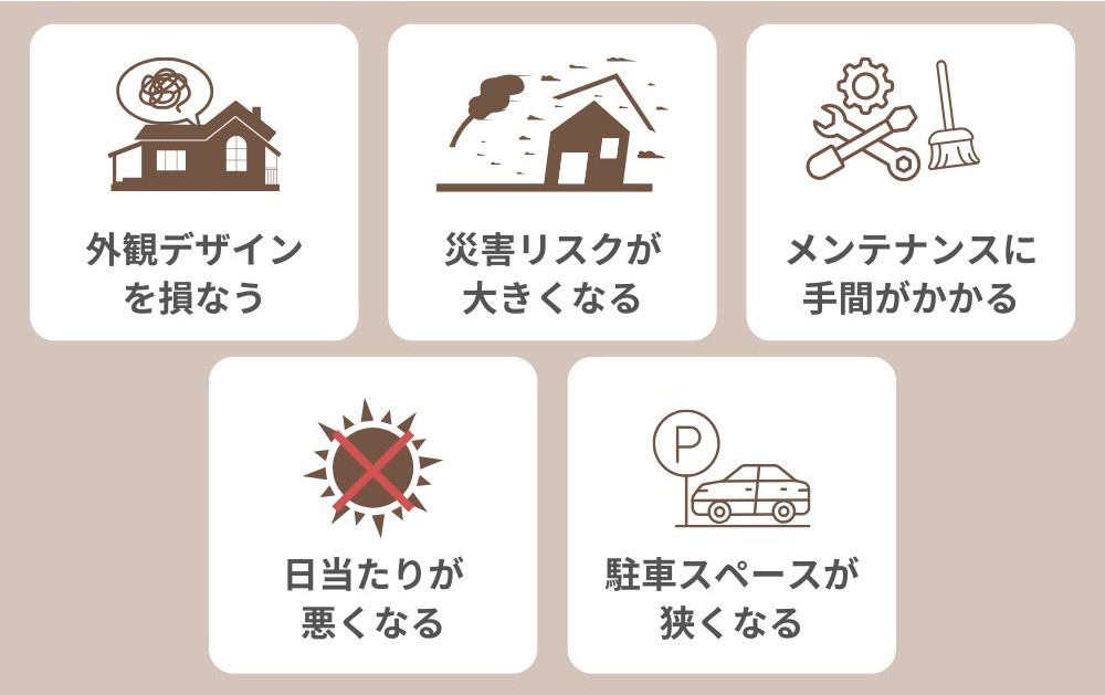 建物の外観・外構コンセプトや選ぶカーポートデザインによっては、バランスが取れず全体のデザイン性が損なわれるかもしれません。