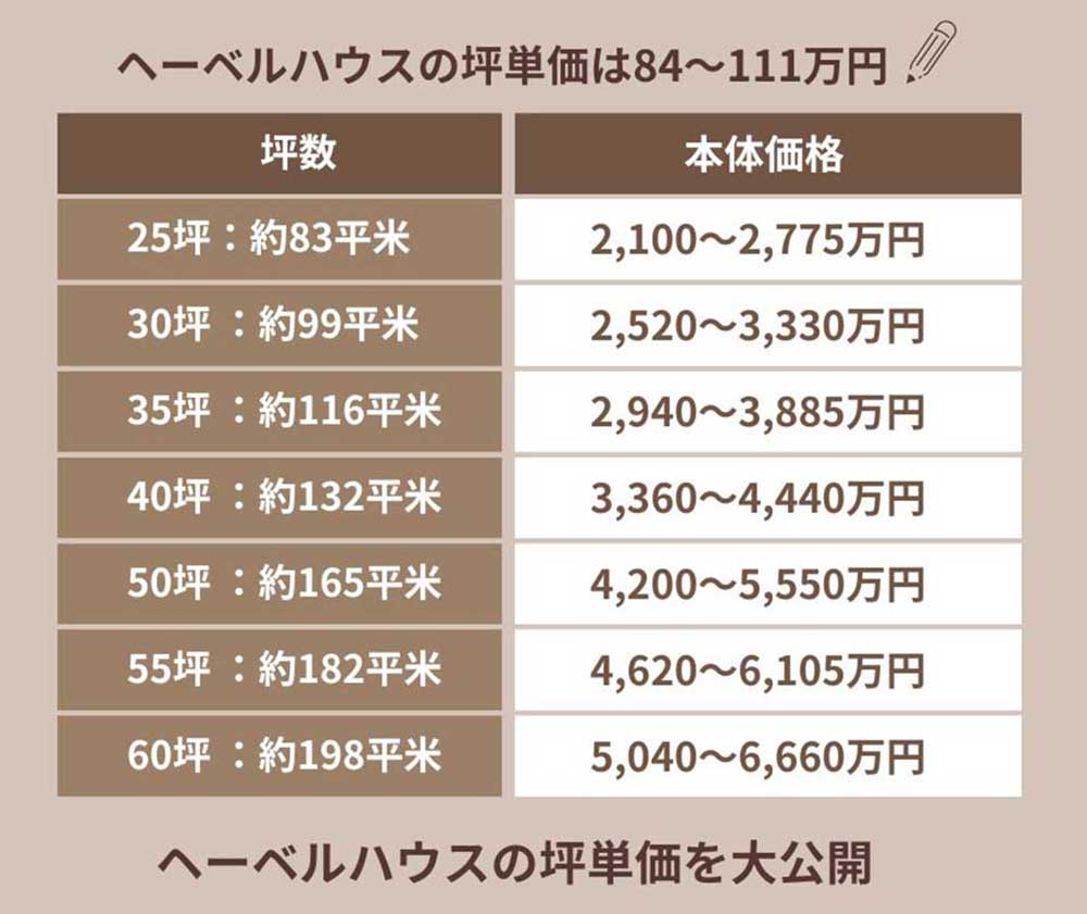 2. ヘーベルハウスの実際の坪単価を坪数ごとに紹介