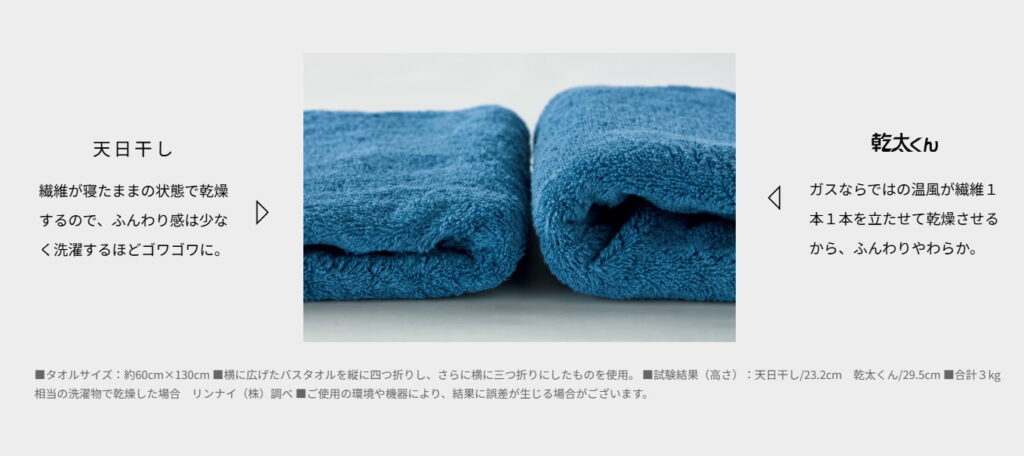乾太くんは、約80℃以上の熱風で乾燥させる仕組みになっているので、衣類の素材によっては縮みや型崩れが生じる可能性があります。
