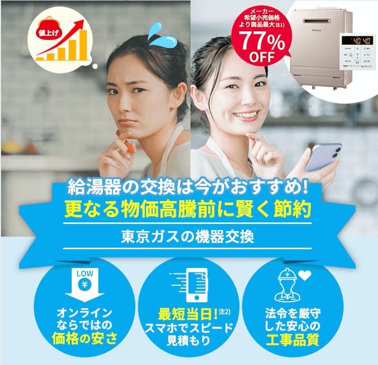 さらに、現在取り付けている給湯器と同じものにするか、最新機器にするか提案を受けられるメリットがあります。