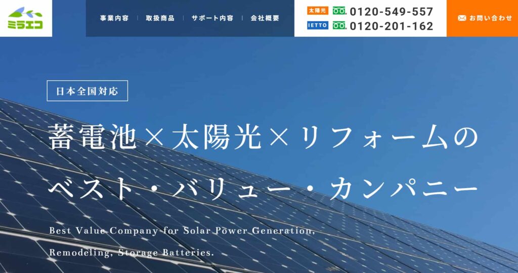 ミラエコは、2021年に設立された『株式会社ミラエコ』が運営する太陽光パネル・蓄電池に特化したサービスです。
