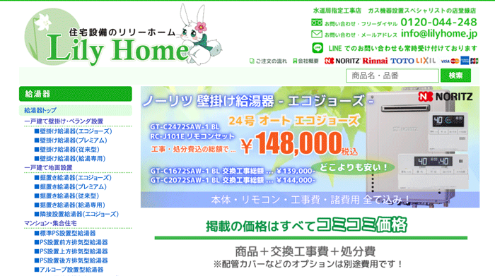 | 取り扱いメーカー | ノーリツ・リンナイ・パーパス・パロマ・ハウステック・タカラ・コロナ、長府製作所、長府興産 etc |