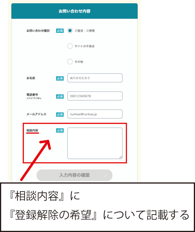 電話が苦手な人は、ヌリカエ公式サイトの「お問い合わせフォーム」から登録解除の依頼を送りましょう。