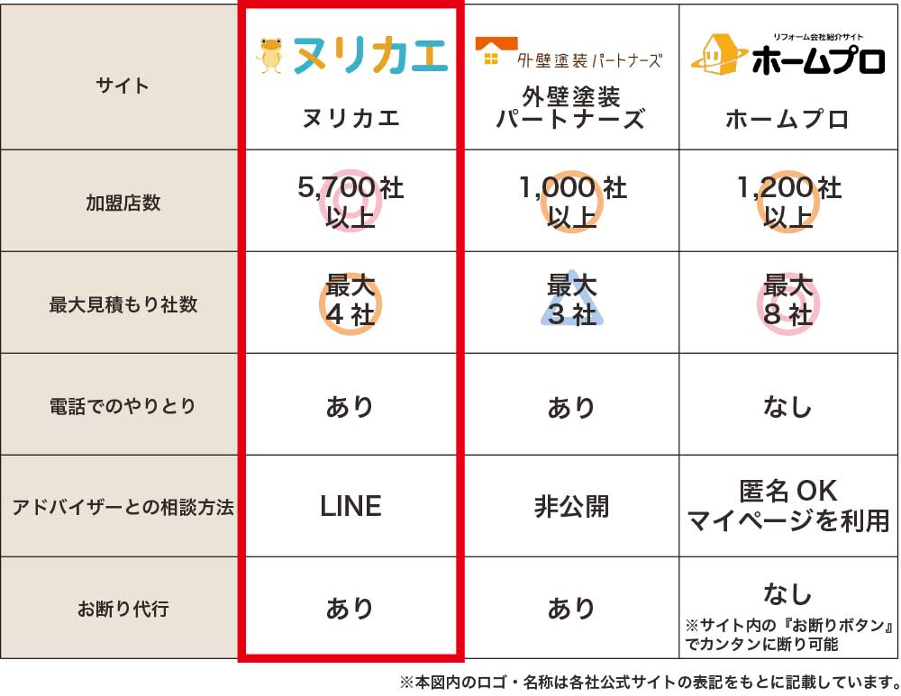 ここでは、ヌリカエとほかの見積もりサイトとの比較を紹介します。