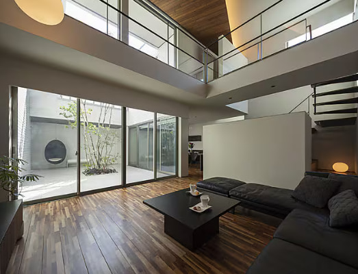 中庭・吹き抜けから光を取り込んだ明るいリビング