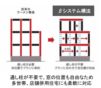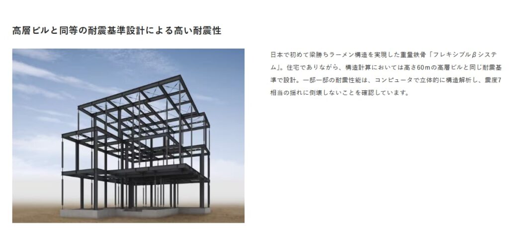 | フレキシブルβシステム | ・鉄骨3・4階建てに採用されている積水ハウス独自の構法 ・「梁勝ちラーメン構造」で通し柱が不要 ・高層ビル並みの強度を備えている |